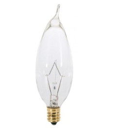 12. Satco S3274-TF 25 Watt CA8 Incandescent, Clear, 1500 Average rated hours, 210 Lumens, Candelabra base, 120 Volt, Shatter Proof