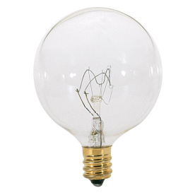 8. Satco A3922-TF 25 Watt G16 1/2 Incandescent, Clear, 2500 Average rated hours, 186 Lumens, Candelabra base, 130 Volt, Shatter Proof